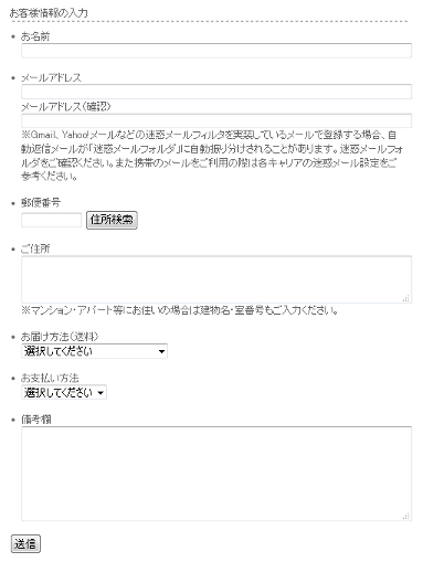 次に、お名前、メールアドレス、ご住所、お届け方法、お支払い方法、備考欄を記入して下さい。![]() |